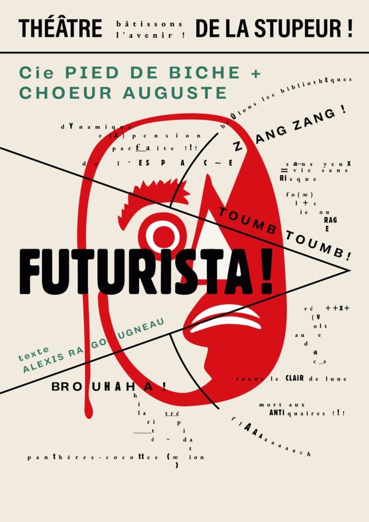 FUTURISTA! fait revivre les folles soirées futuristes où se mêlaient peinture, poésie, numéros de cabaret et adresses provocatrices au public. Le spectacle conte l’histoire d’un fourvoiement, celui du poète Marinetti (1876-1944), qui eut pour ambition de révolutionner l’art italien et finit par sombrer dans la compromission avec Mussolini.